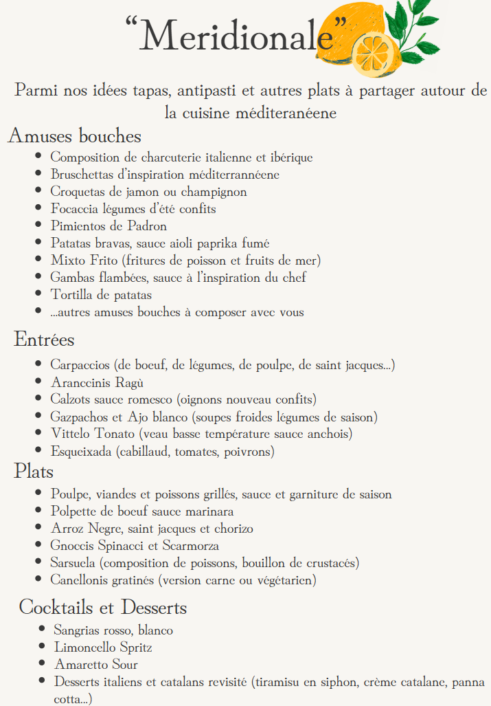 Je vous propose une expérience culinaire unique avec notre spécialité de cuisine méditerranéenne autour des tapas, antipasti et autres plats à partager.